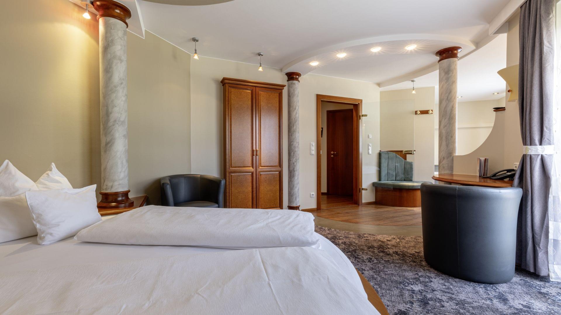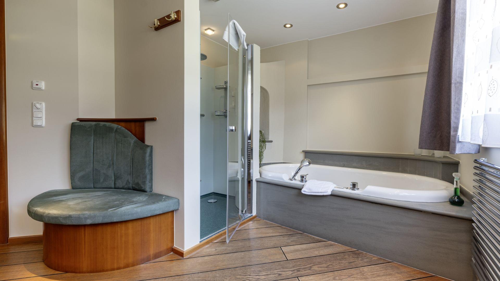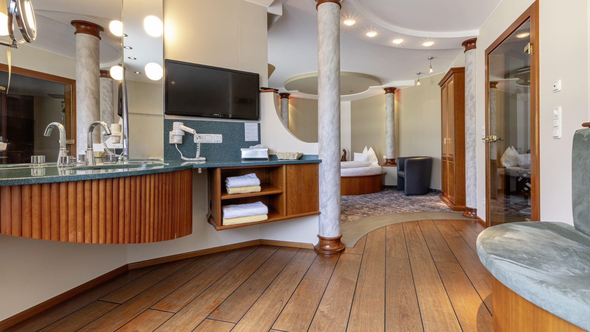 In der Suite "Saturn" ist viel Platz für Zweisamkeit, besonders einladend im halboffenen Badebereich ist die Silent-Whirlwanne. Probieren Sie sie aus und es erwartet Sie ein Gefühl als würden Sie in prickelndem Champagner baden.