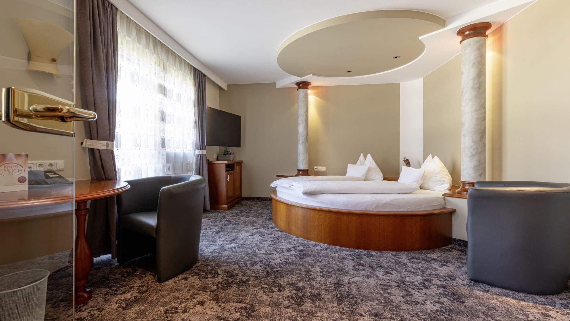 Kuscheln Sie mit der/dem Liebsten im großen Rundbett und entspannen Sie in der Whirlwanne.
