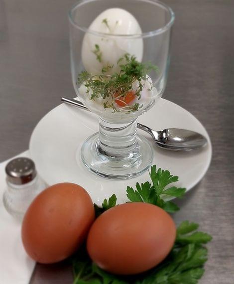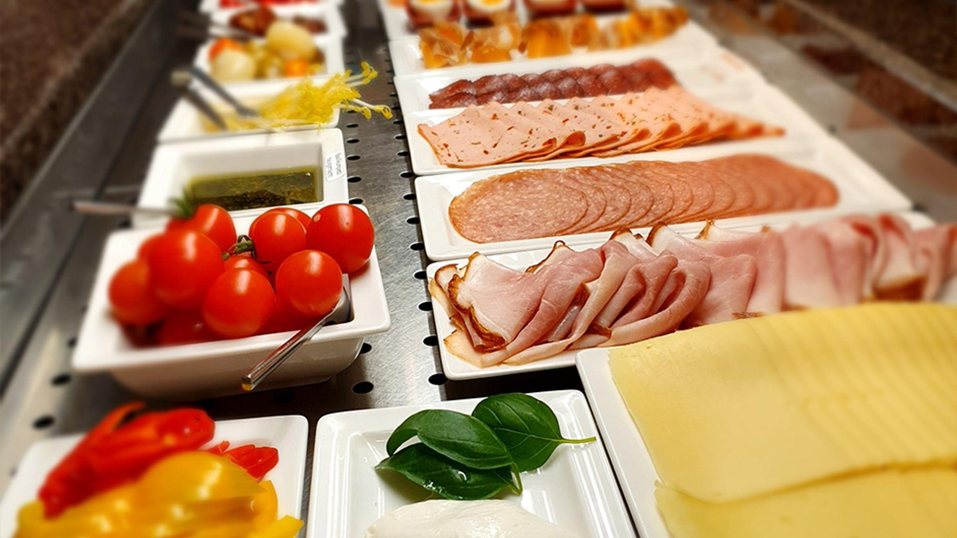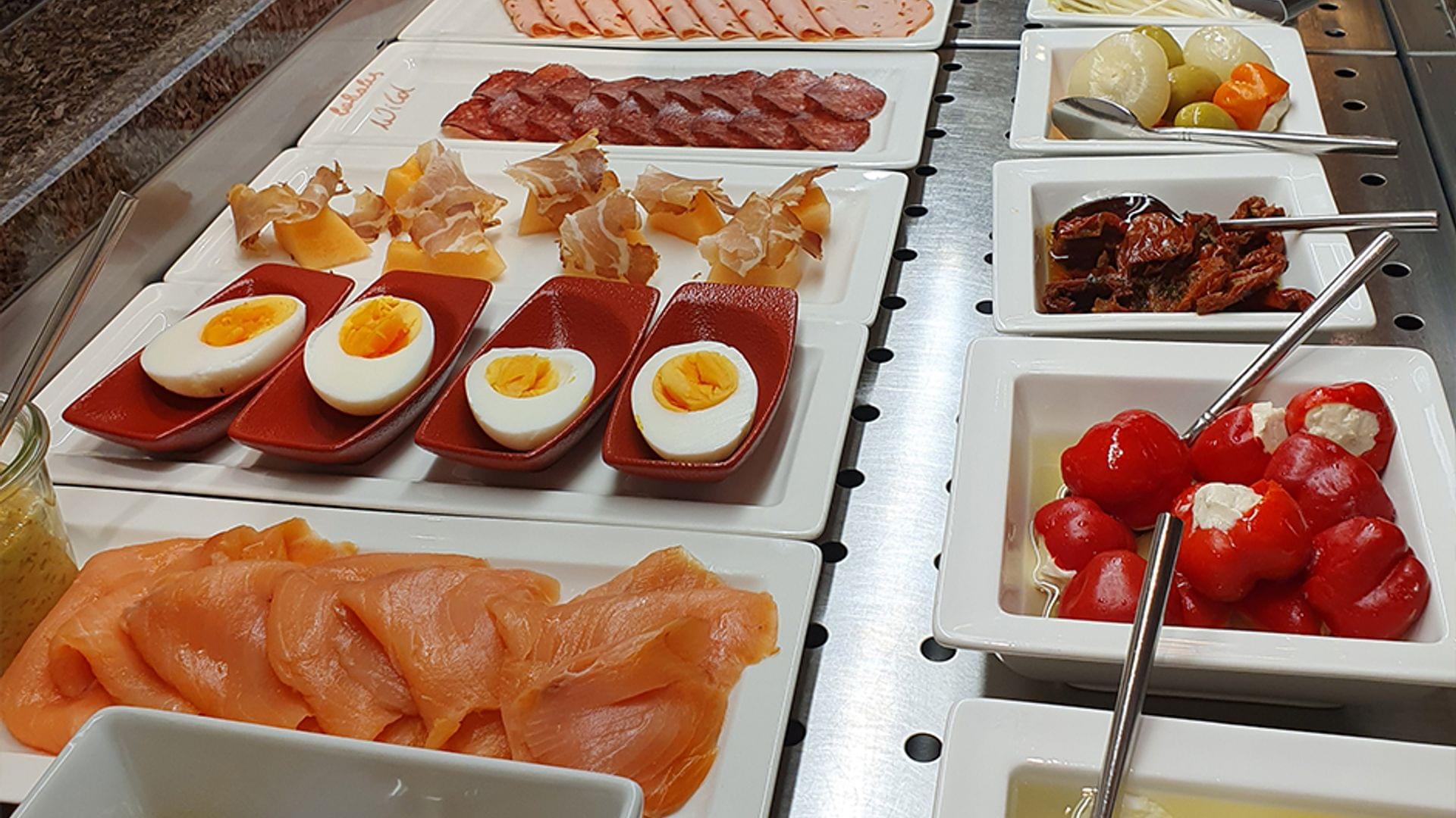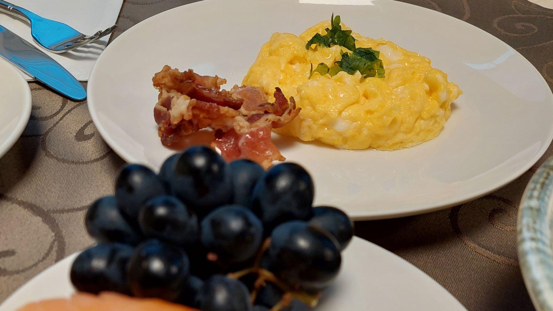 - frisch zubereitete Eierspeisen, gebratenen Speck und Gemüse